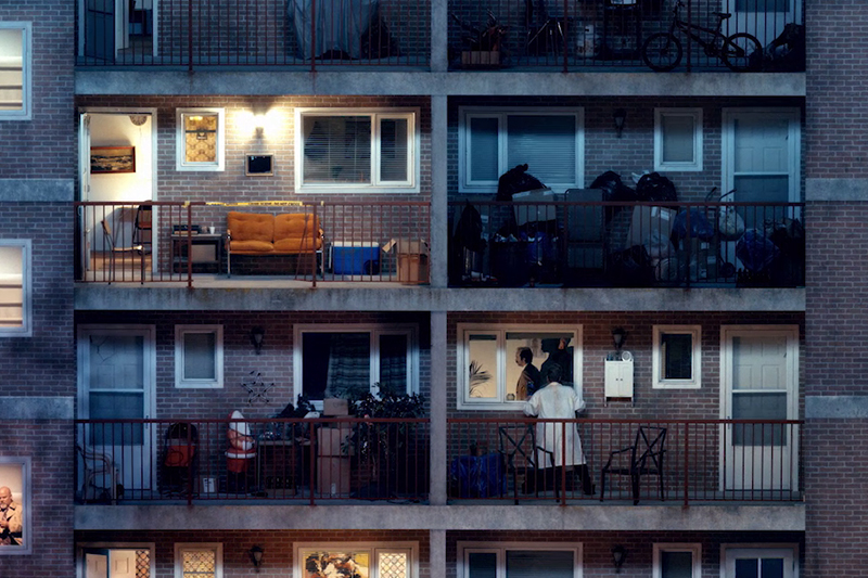 A hurokszerűen ismétlődő kisfilm egy lakótömb életét követi, és megmutatja az erkélyeken zajló kisebb-nagyobb eseményeket.